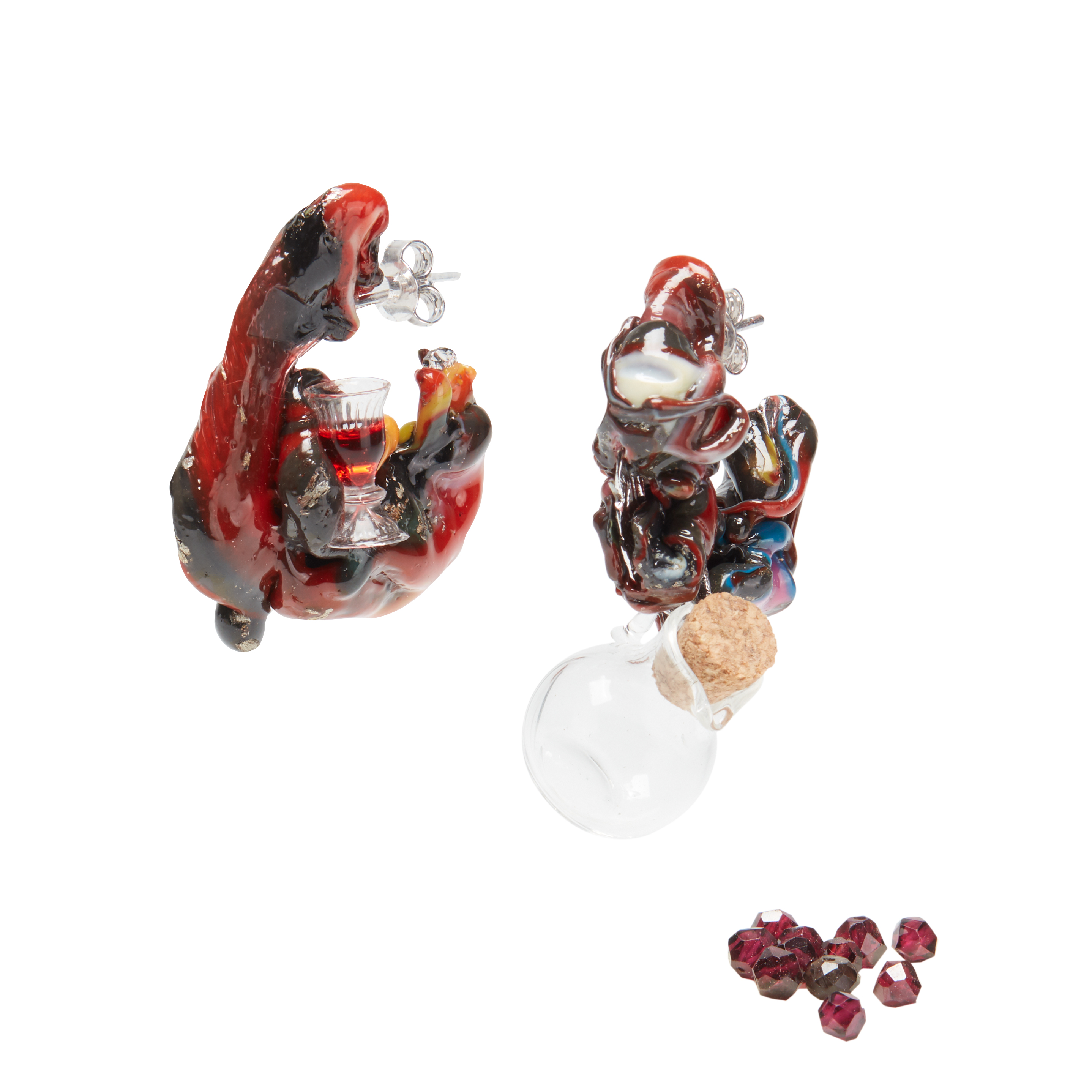 Materiali: plastica multicolor; miniature: bicchiere in vetro, caraffa in vetro con granati e tappo in sughero; struttura in ottone con rodiatura e chiusura a “perno e farfallina” in argento.